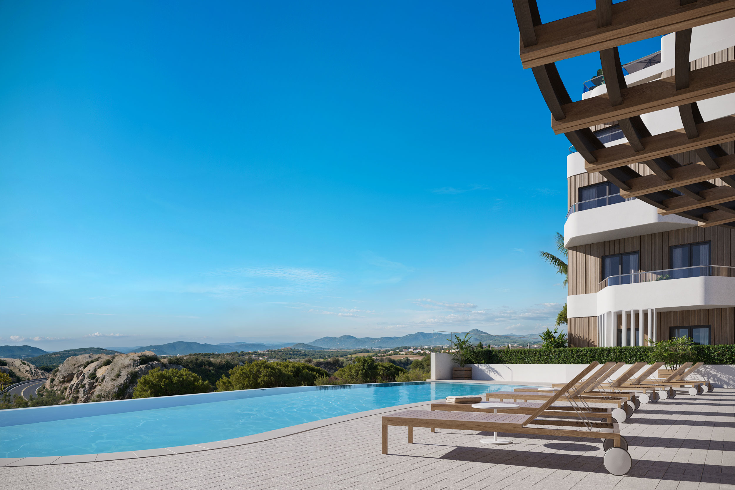 Las zonas comunes se convierten en auténticos espacios de bienestar, con una piscina estilo infinity, pérgolas de madera, áreas ajardinadas y zonas de descanso que refuerzan la sensación de exclusividad.